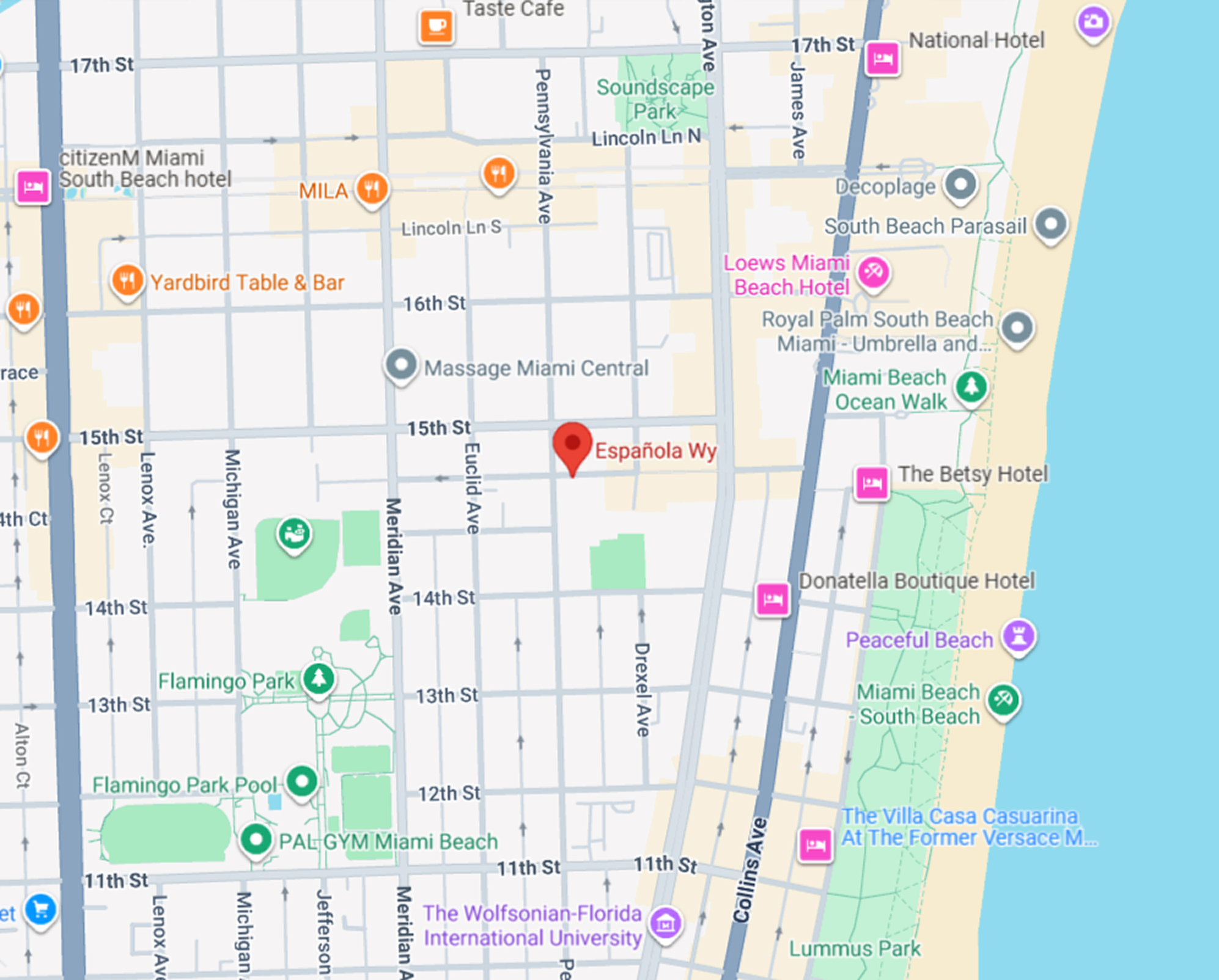 Take FL-112 E towards Miami Beach, Continue I-195 E (Julia Tuttle Causeway) & take exit 5 for Alton Road (South). Continue Alton Road and Left on 15th Street to Drexel Avenue or Washington Avenue